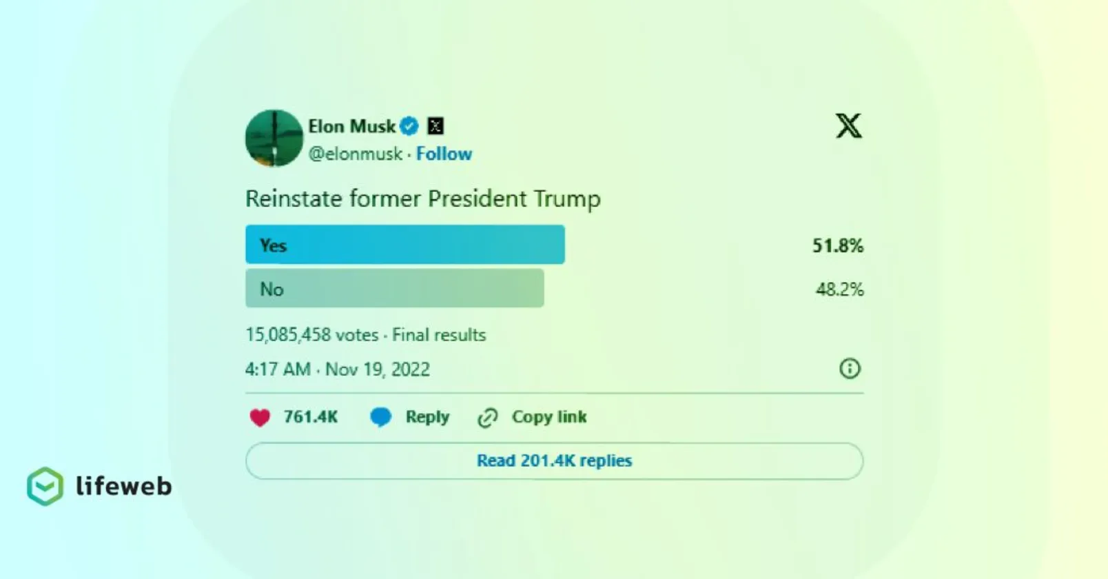 در ۱۸ نوامبر ۲۰۲۲، ایلان ماسک با انتشار یک نظرسنجی در حساب توییتر خود از کاربران پرسید آیا حساب @realDonaldTrump باید بازگردد یا نه. بیش از ۱۵ میلیون نفر در این رأی‌گیری شرکت کردند. حدود ۵۲ درصد به گزینه «بله» رأی دادند. ماسک این نتیجه را بازتاب خواست عمومی دانست. او با عبارت «Vox Populi, Vox Dei»(صدای مردم صدای خداست) اعلام کرد از رأی کاربران تبعیت می‌کند. یک روز بعد، در ۱۹ نوامبر ۲۰۲۲، او حساب دونالد ترامپ را از تعلیق خارج کرد.