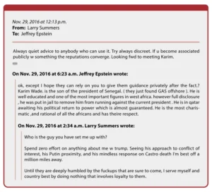 - لری سامرز: “پرواز از ۱۹۹۸“، “جلسات کاری در هاروارد“، و “ایمیل ۲۰۱۹ درباره رابطه عاطفی“