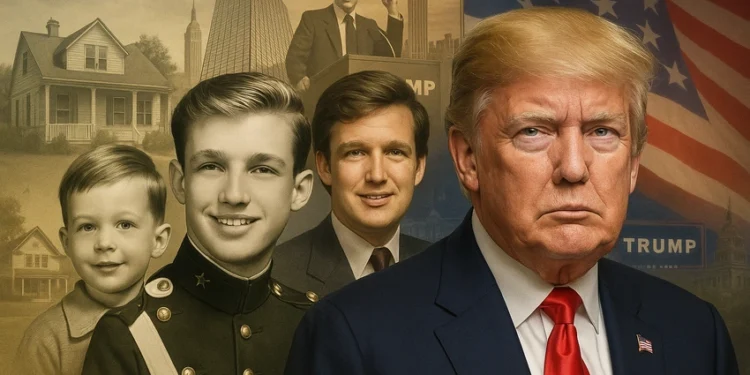 دونالد جان ترامپ در ۱۴ ژوئن ۱۹۴۶ (۲۴ خرداد ۱۳۲۵) در کویینزِ نیویورک به دنیا آمد. او چهارمین فرزند خانواده بود. پدرش فردیک ترامپ سازندهی موفق ساختمانهای مسکونی اجارهای بود. او پس از جنگ جهانی دوم مدتی تبار خود را سوئدی معرفی میکرد، در حالی که ریشهی خانوادگیاش آلمانی بود. مادرش مری مکلئود ترامپ مهاجری اسکاتلندی بود که در ۱۷ سالگی به آمریکا آمد و در سال ۱۹۳۶ با فرد ترامپ ازدواج کرد. خانواده در محلهی مرفه جامائیکا استیتز زندگی میکردند و دونالد کودکی خود را در رفاه گذراند. او از همان سالهای ابتدایی روحیهای جاهطلب و پرخاشگر داشت. خودش در خاطراتش نوشته که «از همان دبستان بچهای جسور و پرخاشگر» بود. این رفتارها والدین را نگران کرد و در ۱۳ سالگی او را به آکادمی نظامی نیویورک فرستادند تا نظم بیاموزد. ترامپ در این مدرسه پیشرفت کرد، ورزشکار شد و نقش رهبری گرفت. او در سال ۱۹۶۴ فارغالتحصیل شد.